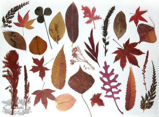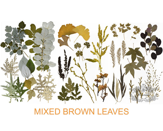 Set of 100 PCS Mix Pressed Real Brown Leaves Assorted Fall Greeny Fern Preserved Mixed Dark Green stems Dried leaf Flat real Dry Flowers